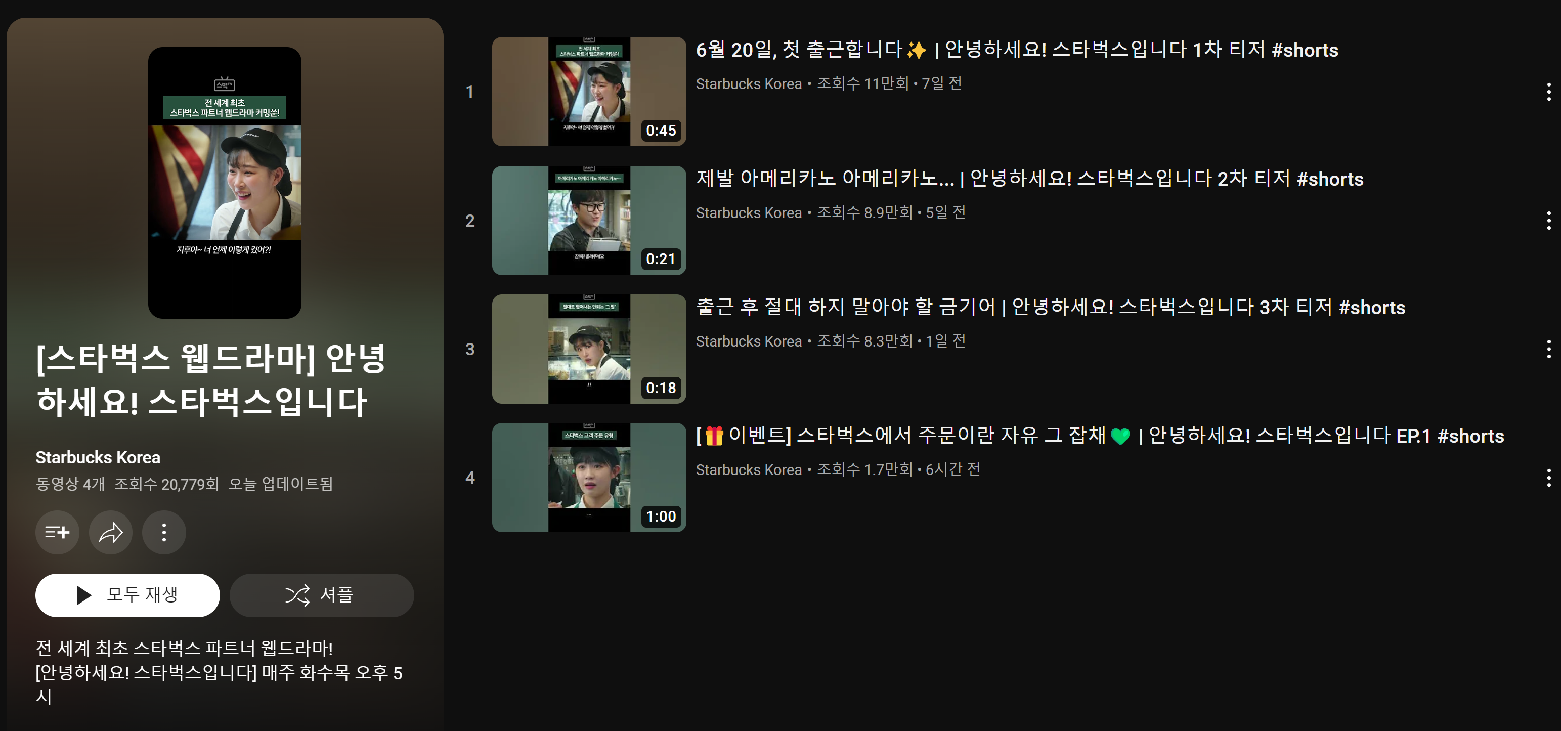 스타벅스 웹 드라마의 경우에는 화요일, 수요일, 목요일 오후 5시에 유튜브 채널을 통해서 시청하실 수 있으며, 음료 제공하는 서비스에 꼭 참여하셔서 음료를 받아가시길 바랍니다.