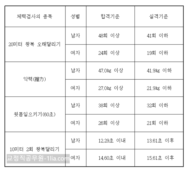 교정직 공무원은 2023년 기준 남성 907명, 여성 32명, 저소득층 27명을 채용하며 시험과목으로는 국어, 한국사, 영어, 형사소송법 개론, 교정학개론 총 다섯 과목으로 필기시험을 본 후 체력시험에 응시할 수 있습니다. 사실 일반 행정직 공무원의 경우에는 필기시험을 합격하고 체력검사를 신경 쓰지 않아도 되지만, 교정직 공무원이나 경찰직공무원의 경우 체력에도 신경 써야 한다는 특징이 있는데요. 체력시험 기준은 아래의 표와 같습니다.