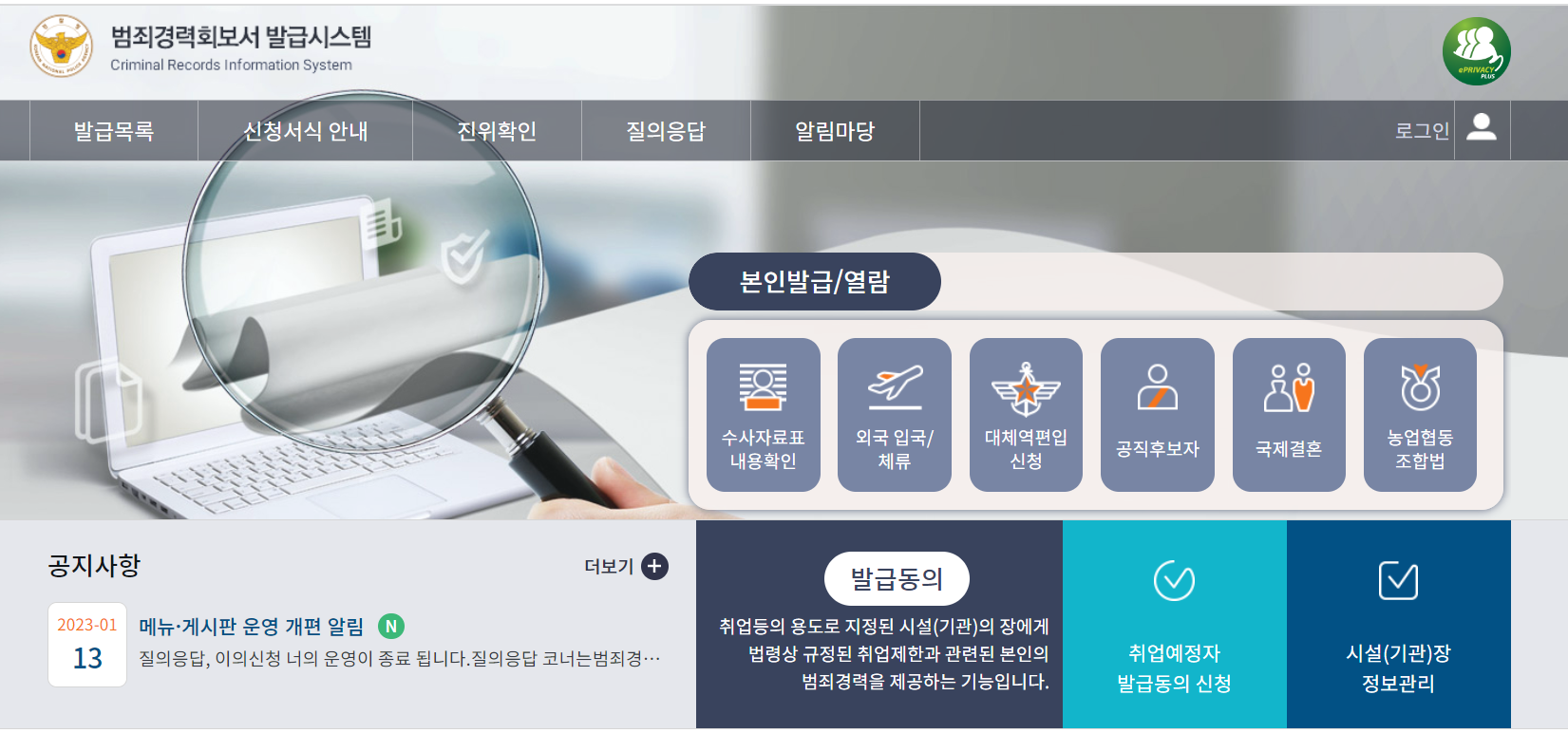첫 번째, "범죄경력회보발급시스템"을 구글에 입력하신 후, 홈페이지에 방문하여 본인인증 후 신청을 하시면 됩니다.