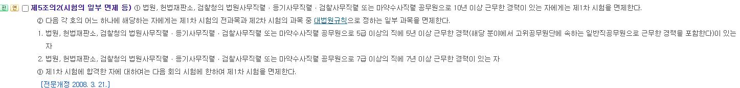- 간략 설명 : 다음에 해당하는 자는 제1차 시험의 전 과목과 제2차 시험의 과목 중 대법원규칙으로 정하는 일부 과목을 면제한다. 법원, 헌법재판소, 검찰청의 법원사무직렬, 등기사무직렬, 검찰사무직렬 또는 마약수사직렬 공무원으로 5급 이상의 5년 이상 근무한 경력 또는 위와 같은 직렬의 7급 이상의 직에 7년 이상 근무한 경력